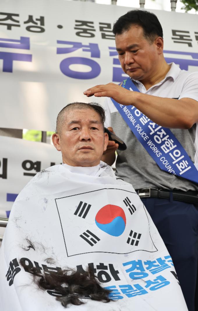 지난 4일 오전 서울 서대문구 경찰청 앞에서 민관기 청주흥덕경찰서 직장협의회장이 행정안전부 경찰국 설치를 반대하며 경찰 77년 역사상 처음으로 삭발하고 있다. 행안부가 경찰국을 철회할 때까지 경찰 노조 격인 직장협의회 소속 현직 경찰들은 매일 3명씩 릴레이 삭발을 이어갈 방침이다. 5일부터는 민 회장이 세종시 행안부 청사 앞에서 단식 시위를 시작한다.