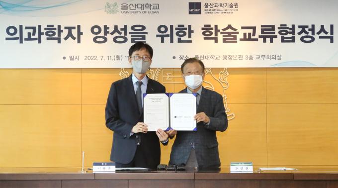 UNIST는 11일 오전 울산대에서 의과학자 양성을 위한 학술교류 MOU를 맺고, 2023년 9월부터 의과학자 양성 프로그램인 'UNIST-울산의대 HST 프로그램'을 공동 운영하기로 했다고 밝혔다.