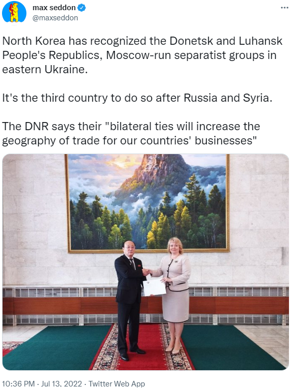 러시아가 지원하는 바샤르 알아사드 시리아 대통령은 지난달 말 이들의 독립을 승인했다. 이어 북한이 DPR과 LPR의 독립을 승인한 세 번째 유엔 회원국이 되었다.