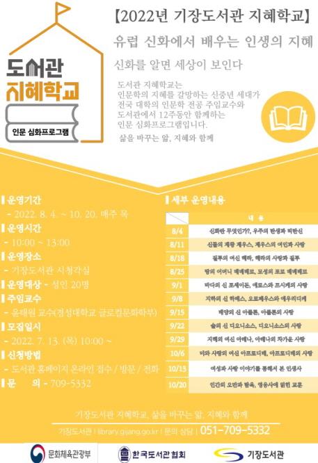 기장도서관은 지역의 인문대학과 연계해 대학교수가 직접 진행하는 토론형 인문학 심화학습 프로그램인 '2022년 지혜학교' 수강생을 모집한다.