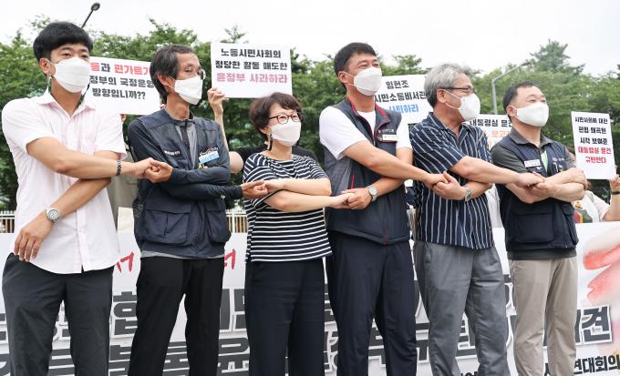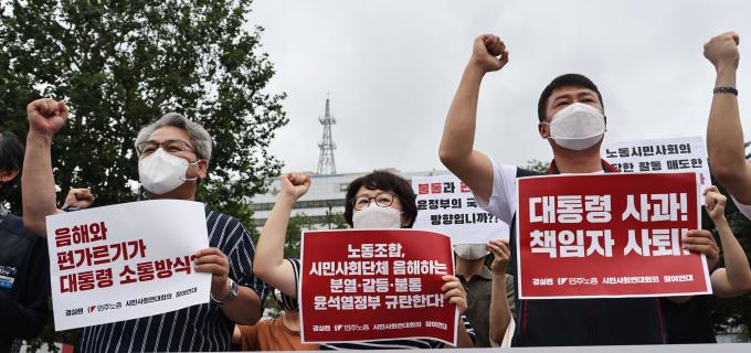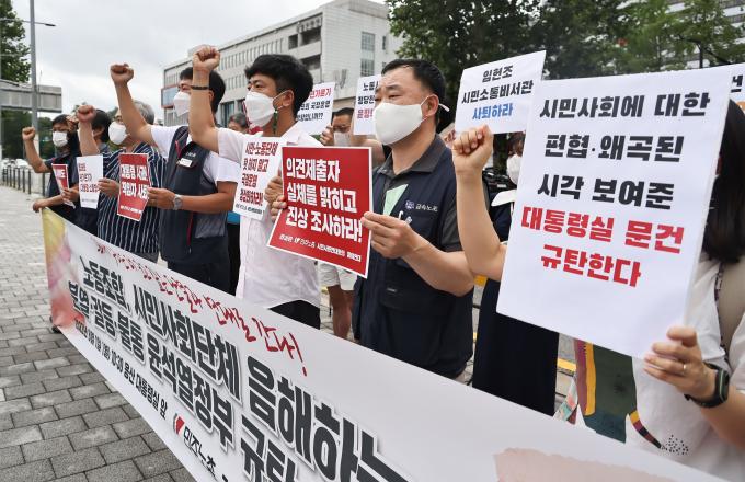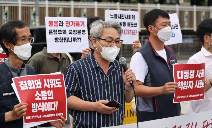 민노총, 경실련, 참여연대 등 시민사회단체 대표들이 1일 오전 서울 용산 대통령 집무실 앞에서 기자회견을 열고 윤석열 정부를 규탄하고 있다. 이들은 최근 언론을 통해 공개된 문건 '용산 대통령 집무실 앞 집회 및 시위 입체분석'을 문제삼았다.