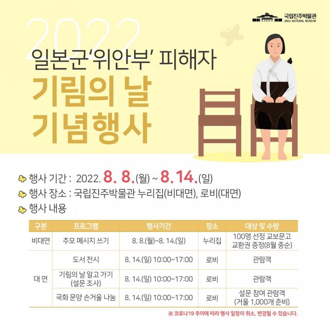 국립진주박물관(관장 장상훈)은 오는 8일부터 14일까지 일본군 위안부 피해자를 기억하고 추모하기 위한 '기림의 날' (매년 8월 14일) 기념행사를 갖는다.