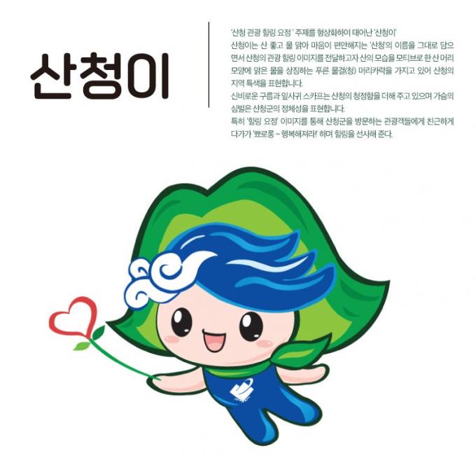 산 좋고 물 맑아 마음이 편안해지는 '산청'의 이름과 모습을 그대로 본 딴 산청이는 산의 모습을 주제로 한 산머리(산) 모양에 맑은 물을 상징하는 푸른 물결(청) 머리카락을 지니고 있다.
