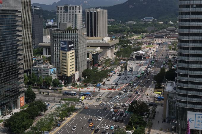 '광화문광장' 총면적은 4만300㎡로 당초(1만8840㎡)보다 2.1배 넓어졌다. 광장 폭은 35m에서 60m로 확대됐다. 광장 곳곳엔 나무 5000그루가 심겼다. 녹지 면적이 9367㎡로는 기존(2830㎡)보다 3.3배 넓어졌다.