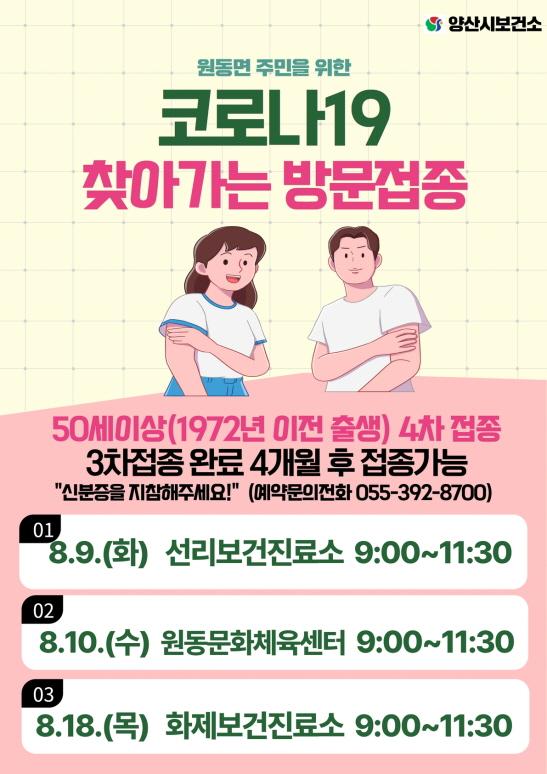 50세 이상 4차 접종대상자 및 기초(1~3차) 미접종자 예약은 양산시보건소 콜센터 또는 읍·면·동 행정복지센터에서 가능하다.