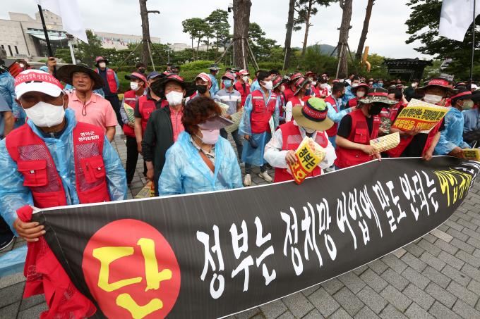 경북정치망어민회 소속 어민들이 8일 오전 서울 용산 대통령 집무실 인근에서 참다랑어 어획량 쿼터제 폐지 촉구 기자회견을 열고 어업규제 완화를 촉구하는 구호를 외치고 있다.