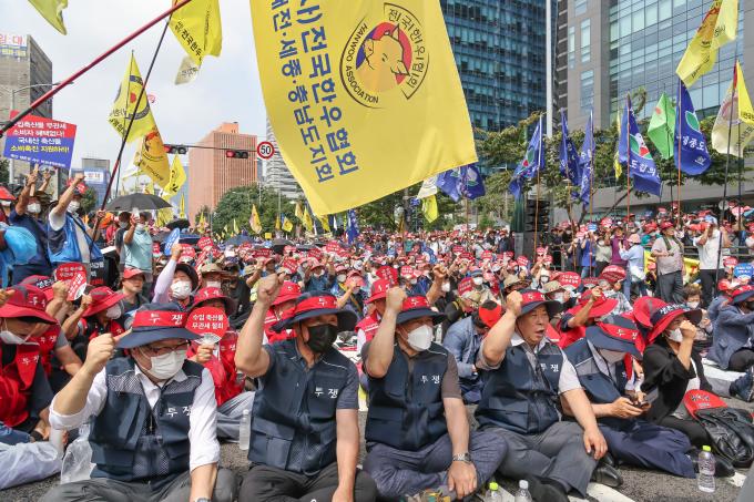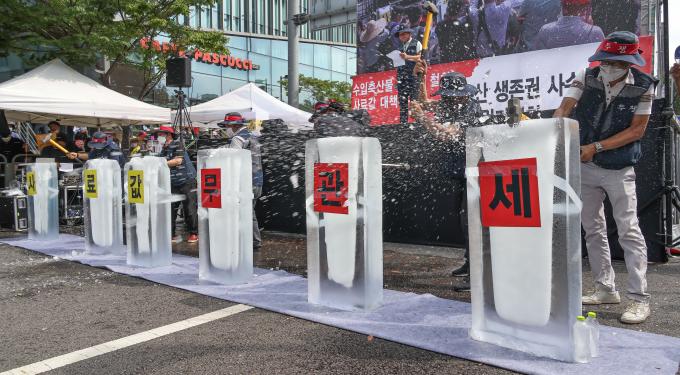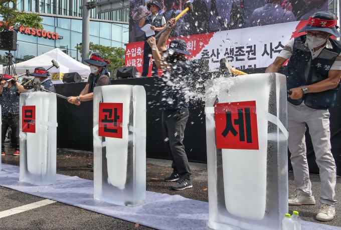 전국의 축산인들이 11일 오후 서울역 앞에서 '축산 생존권 사수 총궐기대회'를 열고 2026년부터 실시할 예정인 무관세 정책을 철회할 것을 요구하며 '사료값 무관세'라고 쓴 얼음을 해머로 깨트리는 퍼포먼스를 하고 있다.