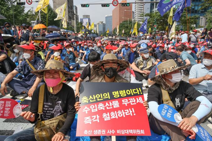 수입축산물 무관세 철회와 사룟값 대책을 촉구하는 전국의 축산인들이 11일 오후 서울역 앞에서 '축산 생존권 사수 총 궐기대회'를 열고 있다.