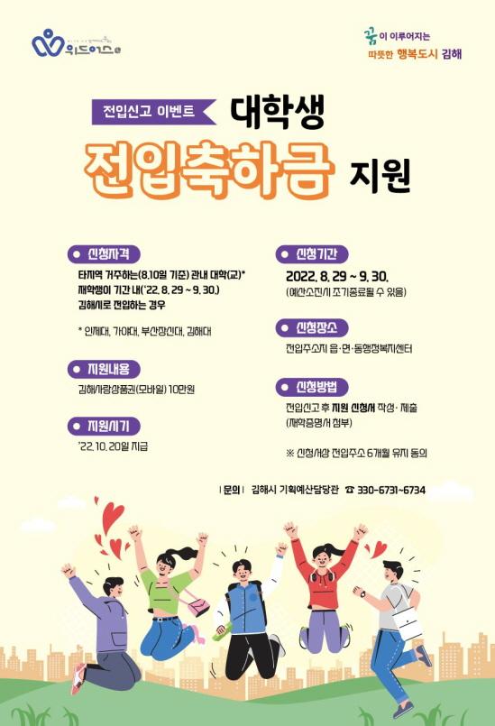 지원대상은 관내 대학(교) 재학 중으로 기간 내 다른 지역에서 김해시로 전입하는 학생이다. 50명에게 선착순으로, 김해사랑상품권 10만 원을 지급한다.