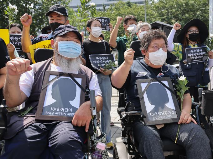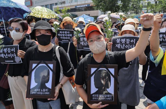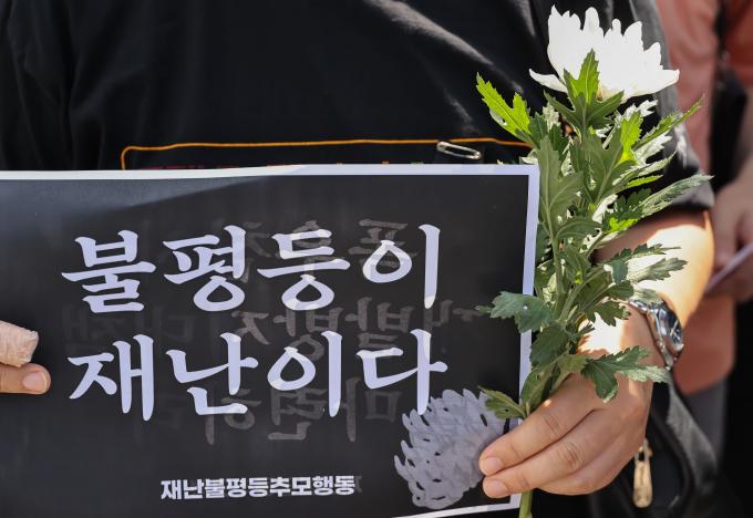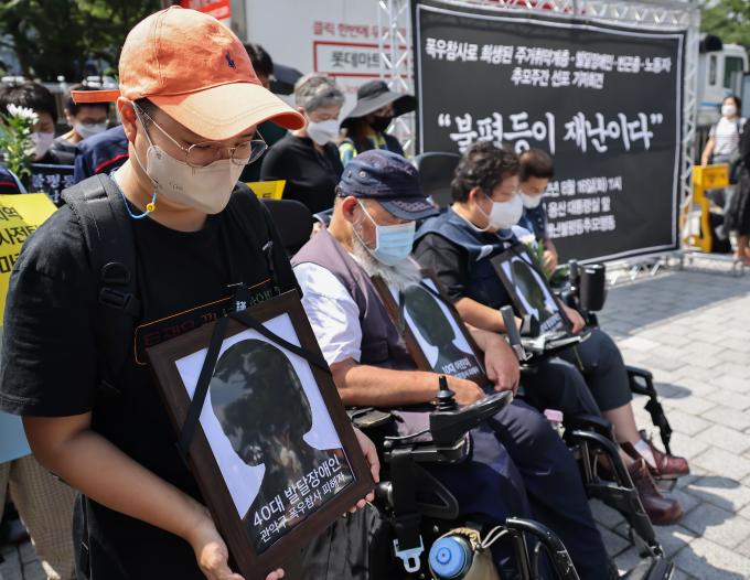 민주노총·전국장애인차별철폐연대·민달팽이유니온 등 시민사회단체로 구성된 재난불평등추모행동 회원들이 16일 오전 서울 용산구 전쟁기념관 앞에서 폭우 희생자 추모주간 선포 기자회견을 열고 묵념하고 있다. 이들은 지난 8, 9일 내린 기록적인 폭우로 주거취약계층, 발달장애인, 빈곤층 노동자 등 불평등한 사회구조 속에서 취약한 조건에 놓인 이들에게 재난 피해가 집중되고 있다며 정부에 재발 방지와 사회적 대책을 촉구했다.