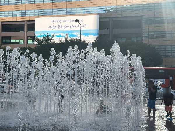 16일 오후 광화문광장 분수에서 아이들이 물놀이를 즐기고 있다. 30도를 웃도는 무더위를 시원한 물줄기에 날려보내니 피서가 따로 없다. 분수 너머 교보문고 건물에는 '우리들 두 눈에 그득히 물결치는 시작도 끝도 없는 바다가 있다'라는 문구가 걸려있다.