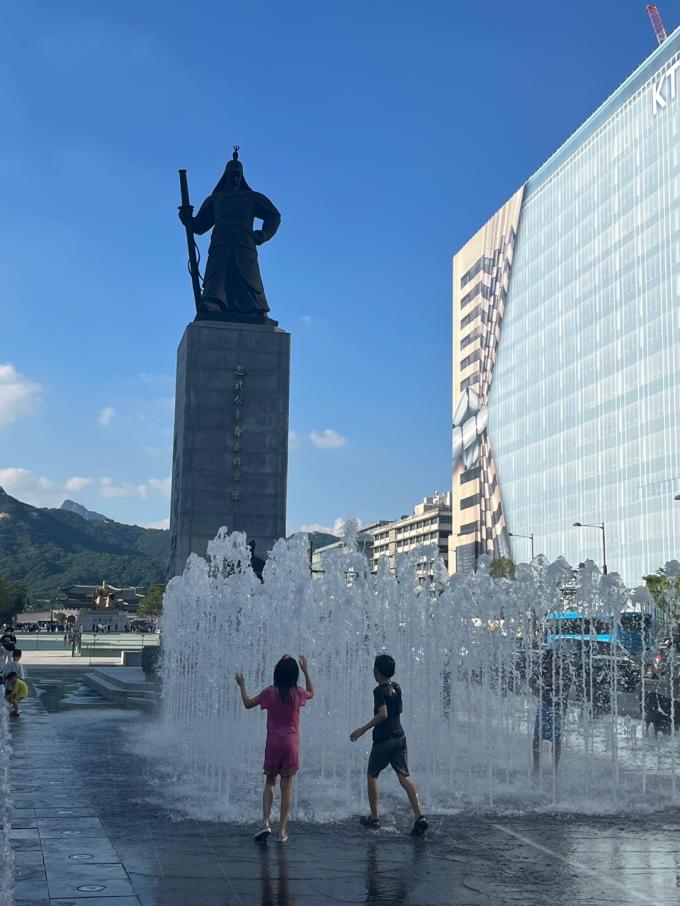 16일 서울 광화문광장 분수에서 뛰어노는 아이들을 이순신 동상이 내려다보고 있다. 저 멀리에는 세종대왕상이 보인다.