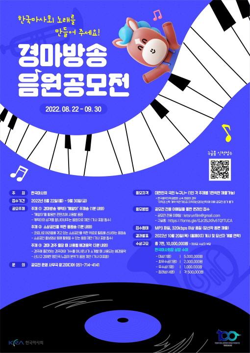공모 주제는 △경마방송 캐릭터 '깨알이' 주제송(1분가량, 가사 필수) △소상공인 응원송(1분, 가사 필수) △경마 경주 배경음원(3분, 가사 미포함) 등 3가지다. 세부 사항은 마사회 홈페이지에서 확인 가능하다.