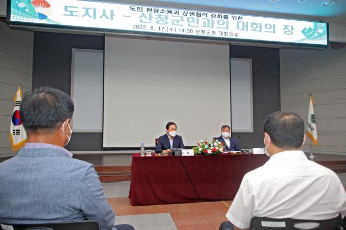 산청군청 대회의실에서 이뤄진 '도지사-도민과의 대화'에는 이승화 군수, 정명순 군의회 의장, 경남도의회 신종철 의회운영위원장 등 기관 대표 24명, 단체 및 지역 대표 44명 등 200여 명이 참석했다.