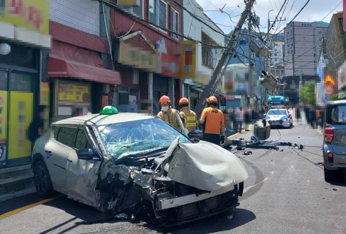 이 사고로 택시 기사(60대)와 파편을 맞은 보행자(50대)가 다쳤고, 주차돼 있던 승용차와 오토바이가 파손됐다. 부상자의 상처는 다행히 크지 않는 것으로 알려졌다.