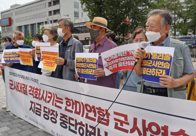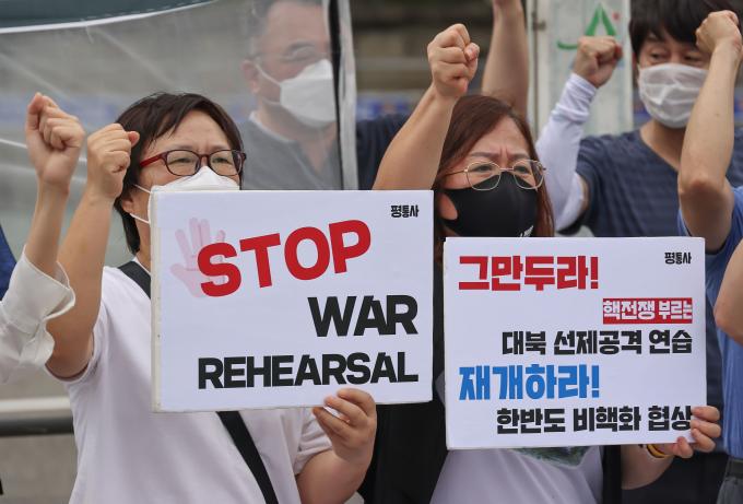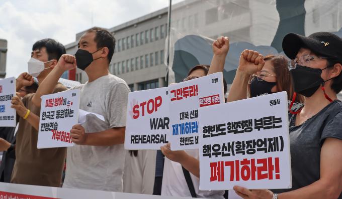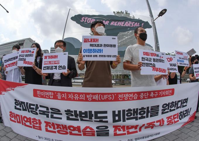 한미연합 '을지 자유의 방패(을지프리덤실드·UFS)' 훈련이 시작된 22일 오전 서울 용산 대통령 집무실 앞에서 '평화와 통일을 여는 사람들'(평통사) 회원들이 기자회견을 열고 전쟁 연습 중단을 촉구하고 있다. 이날 시민단체들은 비슷한 시간대에 기자회견을 열어 '을지 자유의 방패' 훈련이 2018년 이후 중단되었던 대규모 실기동 훈련으로, 북한 무력 점령까지 포함하는 공세적인 훈련이라고 지적했다. 이어 "자칫하면 한반도를 핵전쟁으로 몰아넣을 수 있는 훈련"이라며 즉각 중단을 촉구했다.