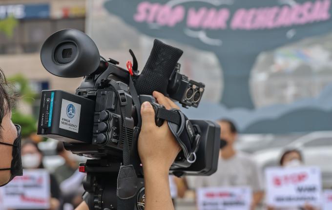 한미연합 '을지 자유의 방패(UFS)' 훈련을 반대하는 시민단체 회원들의 기자회견을 중국 신화사 기자가 촬영하고 있다.