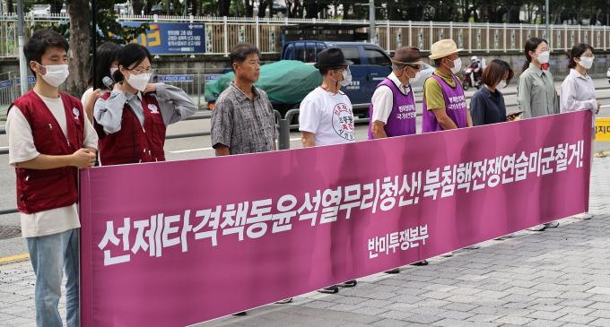 반미투쟁본부 회원들이 22일 오전 서울 용산 대통령 집무실 앞에서 한미연합 '을지 자유의 방패(UFS)' 훈련을 반대하는 기자회견을 열고 기자회견을 열고 한미 전쟁 연습 즉각 중단을 촉구하고 있다.