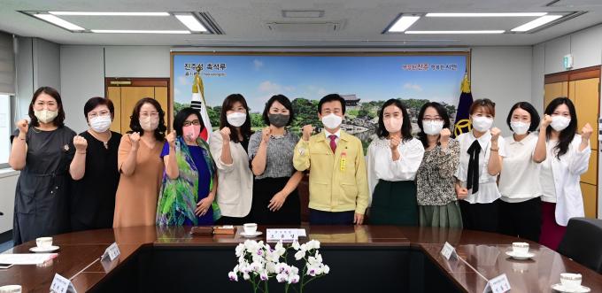 정민정 회장은 진주시에서 코로나19 관련 소독용품, 코잡꾸러미, 자가진단키트, 마스크, 비접촉식 발열체크기 등 방역물품을 시의적절하게 지원해준 것에 대해 감사의 뜻을 전했다.