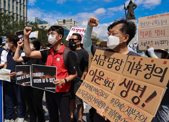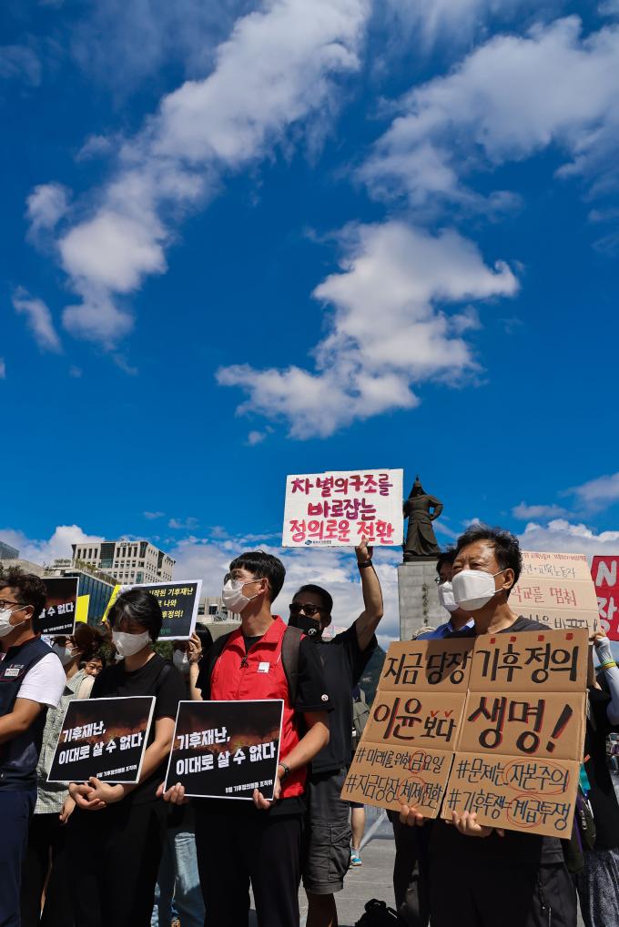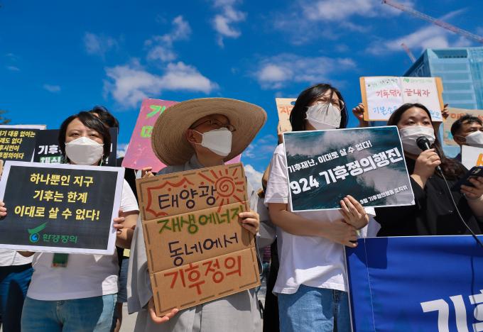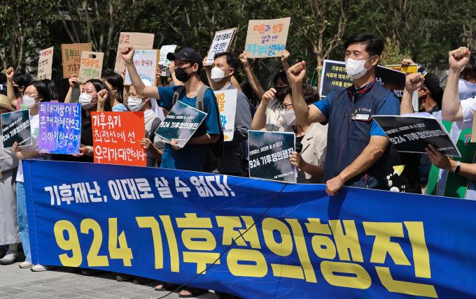 '9월 기후정의행동' 조직위원회가 24일 서울 광화문광장 이순신장군 동상 앞에서 924기후정의행진 활동 계획을 발표하는 기자회견을 열었다. 이들은 기후위기 시대 모두가 함께 평등하고 존엄한 삶을 살아가기 위해서는 기업들의 이윤 극대화로 파괴되는 지구생태계를 살려야 한다고 주장하며, 9월 24일 기후정의를 기치로 거대한 행진을 시작한다고 결의했다.