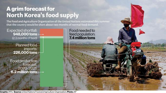 FAO는 신종 코로나바이러스 감염증의 세계적 대유행 확산 통제 조치로 경제적 제약이 늘면서 필수 농산물과 인도적 물품 수입이 크게 감소해 북한 주민들의 식량 안보 취약성은 더욱 커졌다고 밝혔다.