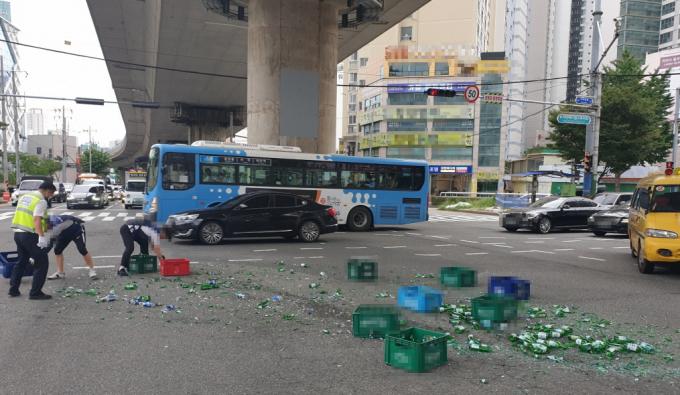 떨어진 맥주·소주 유리병은 현장에 출동한 경찰과 트럭 운전자 등의 합동 작업으로 30여분 만에 모두 수거돼, 교통이 정상적으로 이뤄졌다.