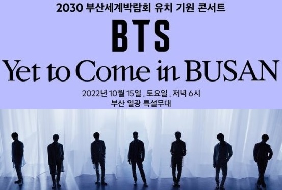 BTS 부산 콘서트('Yet To Come' in Busan)는 10월 15일 기장군 옛 한국유리 공장 부지 특설무대에서 열린다. 관객 입장수는 10만 명이다. 같은 시각 부산항 국제여객터미널 야외주차장에는 화상 중계콘서트(1만 명 예정)가 열린다.