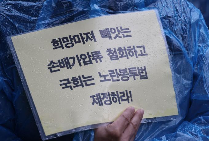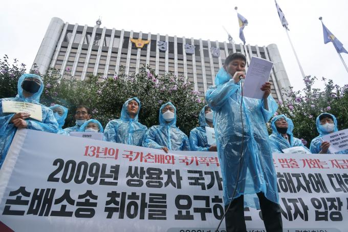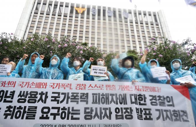 30일 오전 서울 서대문구 경찰청 정문 앞에서 '쌍용차 국가손배 당사자 트라우마 진단서 제출 및 경찰청 소취하 요구 기자회견'이 열렸다. 기자회견 참석자들은 "'2009년 쌍용차 사태' 이후 노동자들이 13년째 국가의 손배소송으로 고통을 받고 있다"며 "경찰청 인권침해진상조사위원회의 진상조사 결과 국가폭력이 있었음을 인정하고 국가손배소 취하를 권고한 것처럼 경찰청이 국가손배소를 취하하라"고 촉구했다.