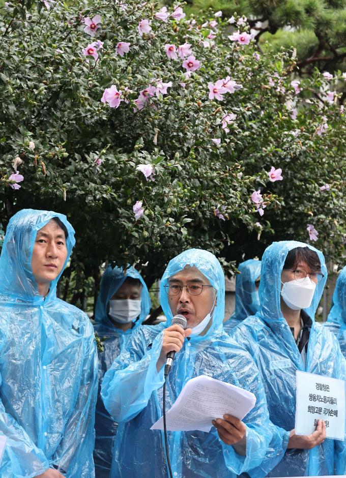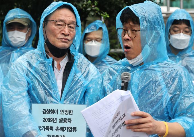 30일 오전 서울 서대문구 경찰청 정문 앞에서 열린 '쌍용차 국가손배 당사자 트라우마 진단서 제출 및 경찰청 소취하 요구 기자회견'에서 쌍용차 사태를 주도했던 한상균 전 전국민주노동조합총연맹 위원장(오른쪽)이 기자회견문을 읽고 있다.