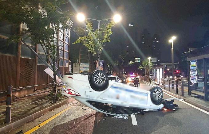▲ 4일 새벽 해운대구 재송동 간선 도로에서 발생한 택시 전복사고 현장 [부산경찰청 제공]