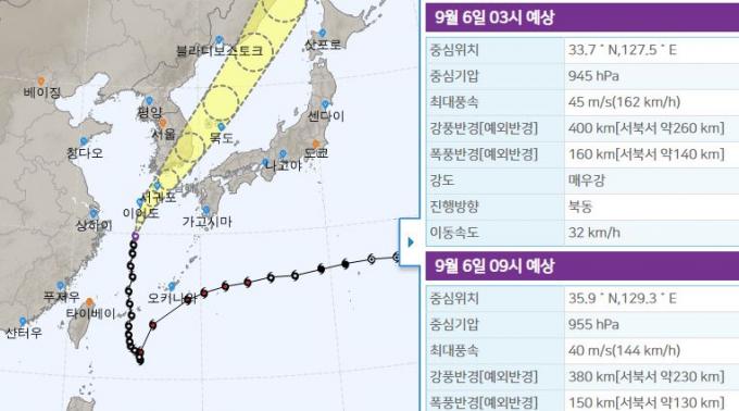 6일 상륙할 때 태풍 강도는 '매우 강'으로, 최대 초속 풍속은 45m에 달한다. 중심기압은 945hPa(헥토파스칼)로, 1959년 '사라'와 2003년 '매미'보다 더 강력하다. 태풍은 중심기압이 낮을수록 위력적인데, '사라'와 '매미'의 중심기압은 각각 951.5hPa와 954hPa이었다.