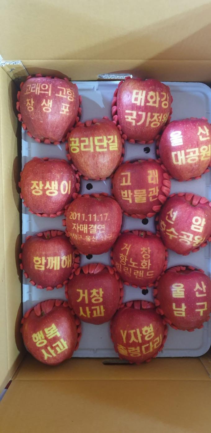 사과에 새겨진 글귀는 자매도시의 명소, 특산품, 슬로건 등이다. 특히 올해는 사과의 착색 정도가 좋고 생산 농가와의 조기 계약을 통해 추석 명절에 맞춰 출하되면서 사업의 효과를 배가시켰다는 게 거창군의 설명이다.