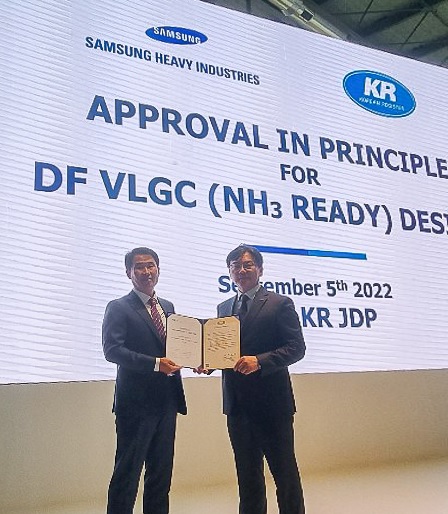 이번 AIP를 받은 대형 가스운반선(VLGC·Very Large Gas Carrier)은 KR과 삼성중공업 간 진행된 공동개발프로젝트(JDP)의 결실이다. 암모니아를 운송하면서 암모니아를 추진 연료로도 사용, 운항 과정에서 탄소를 배출하지 않도록 개발된 친환경 선박이다.