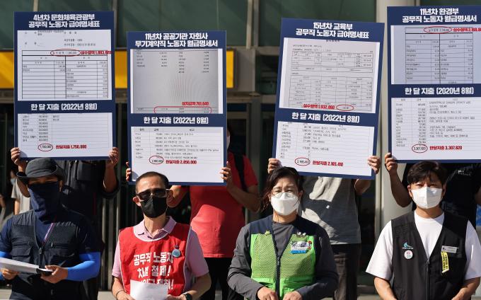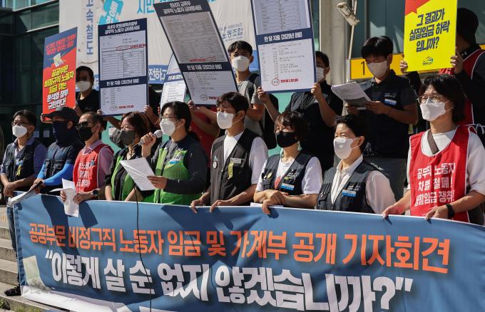 귀성객들이 붐비는 8일 서울역 입구에서 민주노총 공공운수노조 조합원들이 '이렇게 살 순 없지 않겠습니까? 공공부문 비정규직 노동자 임금 및 가계부 공개 기자회견'을 열었다. 조합원들은 "2022년도 물가 상승률이 5~6%에 이를 것으로 예상되는 가운데 내년도 임금인상은 2.2%만 증액했다. 이는 실질적 임금 삭감"이라며 그동안 비정규직들이 받는 임금 내용을 공개했다. 이들은 최근 높아진 물가 인상을 고려해 저임금에 시달리는 공공부문 비정규직 노동자들의 실질임금이 삭감되지 않도록 해줄 것을 정부에 촉구했다.