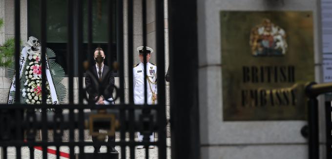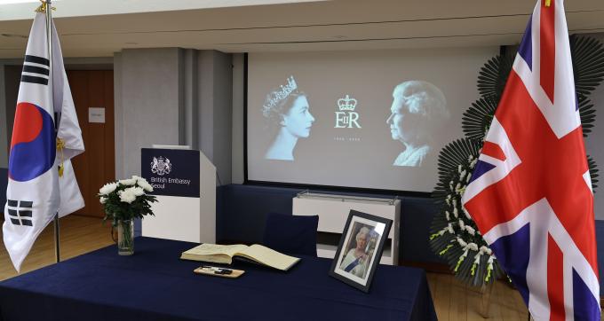 13일 오전 서울 중구 주한영국대사관에 마련된 고 엘리자베스 2세 영국 여왕 분향소. 대사관 관계자들이 조문객을 맞을 준비를 하고 있다. 주한영국대사관은 13일부터 16일까지 조문객을 받는다고 밝혔다. 조문 가능 시간은 오전 10시~오후 4시.