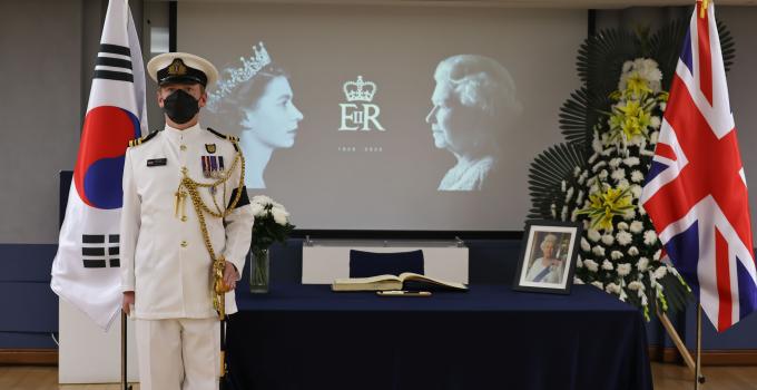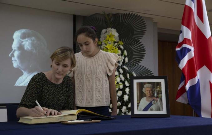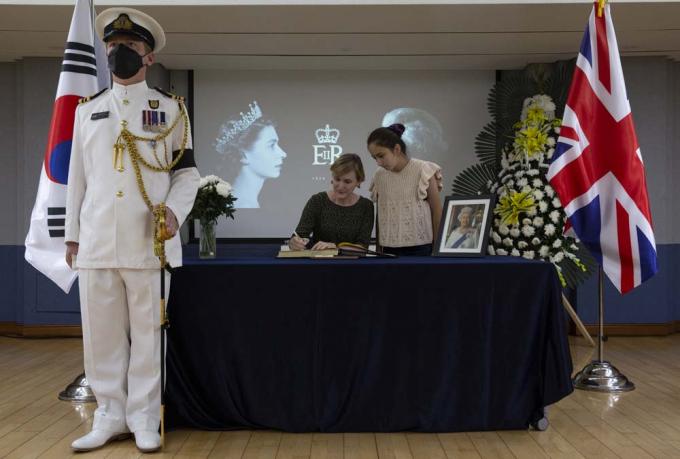 13일 오후 주한영국대사관에 마련된 엘리자베스 영국 여왕 분향소를 찾은 영국인 모녀가 조문을 한 뒤 방명록에 서명을 하고 있다.