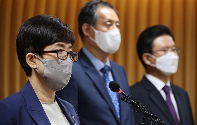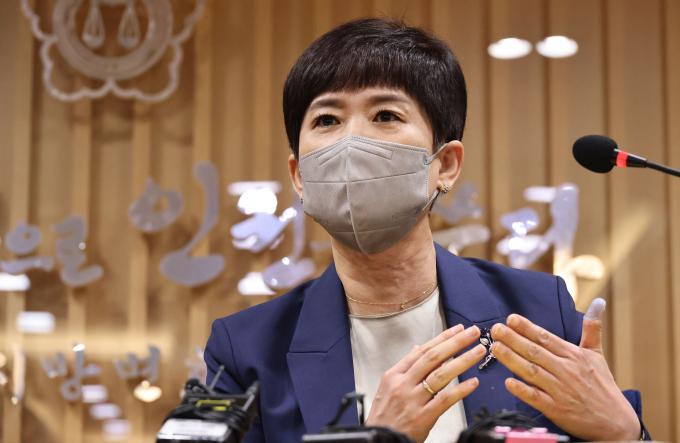안미영 '공군20전투비행단 이예람 중사 사망사건관련 군내성폭력 및 2차피해 등의 진상규명을 위한 특별검사'가 13일 오후 서울 서초동 서울지방변호사회 강당에서 수사 결과를 발표하고 있다. 특검은 공군 법무관 출신 변호사 1명을 구속 기소하고 공군본부 법무실장 등 장교 5명, 군무원 1명, 전 부사관 1명등 7명을 불구속 기소했다고 밝혔다.