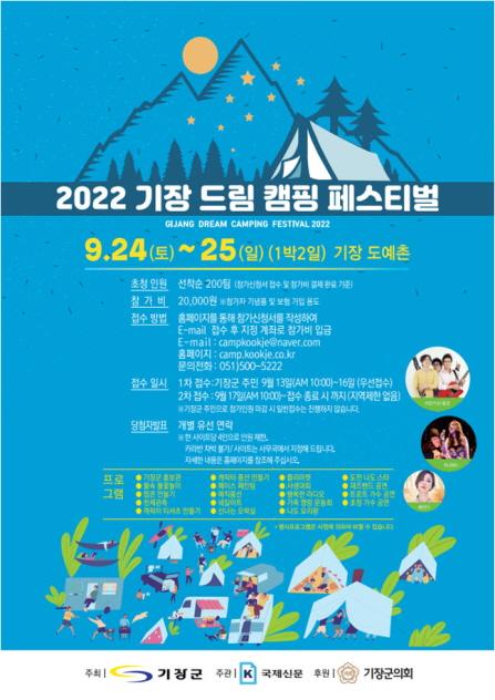 참가 신청은 기장드림캠핑페스티벌 웹 홈페이지를 통해 이뤄진다. 모집 인원은 선착순 200팀이다. 1차 접수는 13일부터 기장군 주민에 한해 우선적으로 진행된다. 이어 17일부터는 지역 제한 없이 누구나 신청할 수 있다.