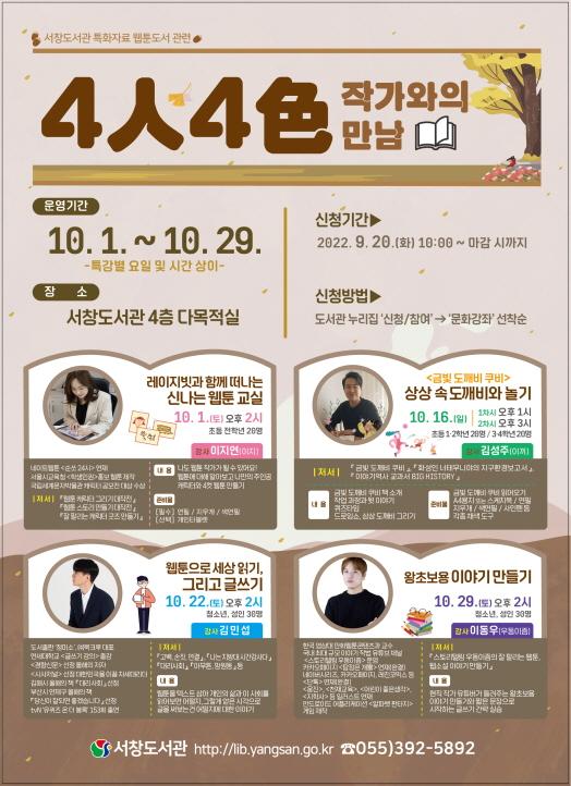 청소년과 성인을 대상으로는 △김민섭 작가의 '웹툰으로 세상 읽기·글쓰기'(10월 22일 오후 2시) △이동우 작가의 '왕초보용 이야기 만들기'(29일 오후 2시) 특강이 이어진다.