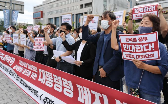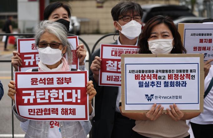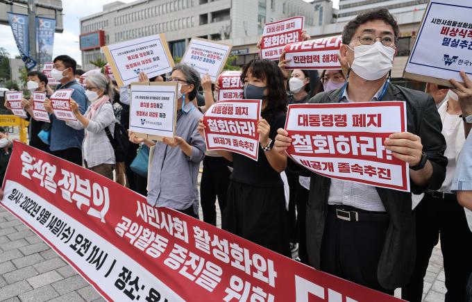 14일 오전 서울 용산 대통령집무실 앞에서 시민사회단체연대회의 주최로 열린 '윤석열 정부의 시민사회 활성화와 공익활동 증진을 위한 대통령령 폐지 추진 규탄 및 반대' 기자회견에서 참석 활동가들이 구호를 외치고 있다.