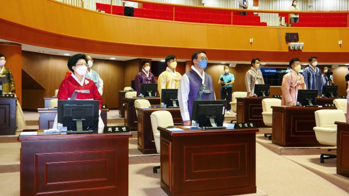 회기 첫날 1차 본회의에는 '실크의 명산지'라는 지역 이미지를 강조하기 위해 의원 전원이 한복을 입고 등원, 눈길을 끌었다. 시의회는 2019년 한복입기 활성화 지원 조례를 제정해 민족 고유 의상인 한복을 입도록 장려하고 있다.