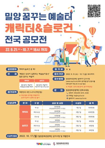 이번 공모는 밀양 꿈꾸는 예술터의 주제인 '해맑은 상상이 실현되는 예술놀이동산'의 대표 캐릭터와 슬로건 등 특화 콘텐츠를 개발하기 위해 진행된다.