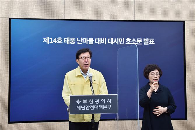 19일 오전 11시 부산 최근접할 시점 순간최대풍속 초속 25m 강풍 제14호 태풍 '난마돌'이 19일 오전 11시 부산에 최근접할 것으로 예보된 가운데 박형준 시장은 18일 상황판단회의를 개최한 뒤 대시민 호소문을 발표했다.