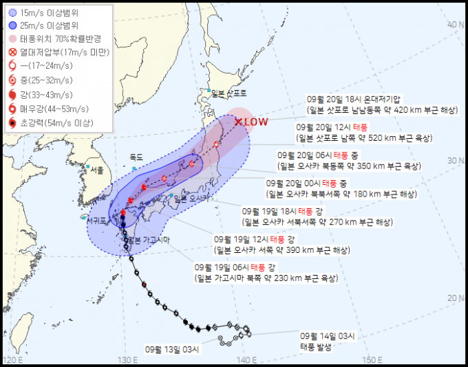 현재 난마돌은 19일 아침 7시 기준 일본 가고시마 북쪽 약 240㎞ 부근 육상에서 시속 16㎞ 속도로 북상 중이다.