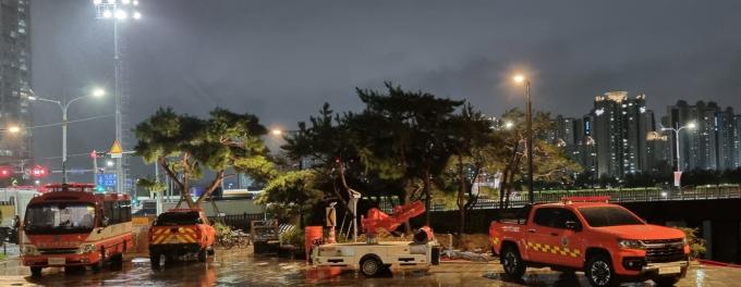 특히 울산소방본부는 제11호 태풍 '힌남노' 상륙 때처럼 대형 화재진압에 이용되는 '대용량포' 방사시스템을 태화루 주차장에 설치해 태화강 범람 및 태화시장 침수해 대비하고 있다.