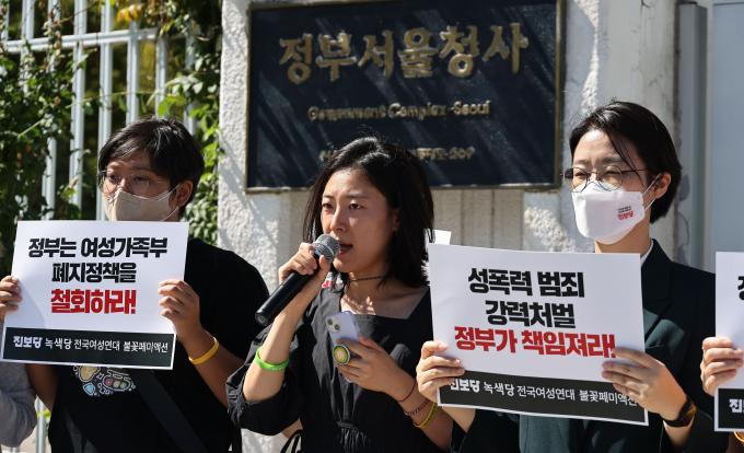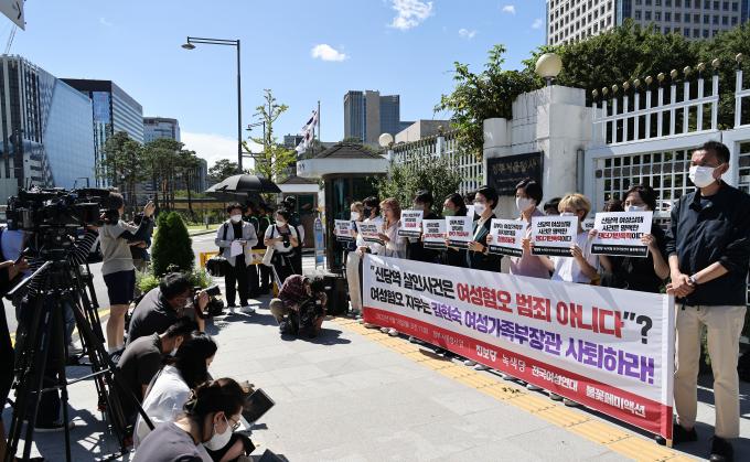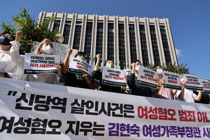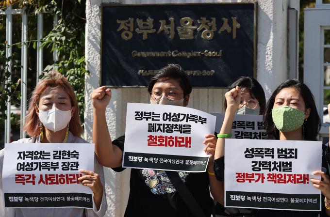 19일 오전 정부서울청사 앞에서 진보당과 녹색당, 전국여성연대 관계자들이 김현숙 여성가족부 장관 사퇴를 촉구하는 기자회견을 하고 있다. 윤희숙 진보당 상임대표는 "이번 사건은 여성혐오 범죄가 아니다"라는 김 장관 발언에 대해 "여성가족부의 폐지를 위해 사건의 본질을 가리려는 의도로 보이는 국민 기만행위"라며 "김현숙 장관은 책임지고 사퇴하라"고 촉구했다.
