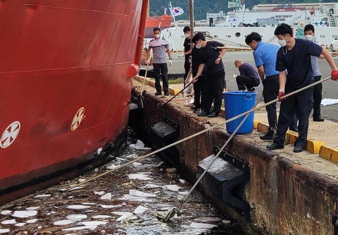 해경은 유막을 제거한 뒤, 통항 선박과 부두에 계류 중인 선박의 시료를 채취해 비교 분석한 끝에 불법 배출 선박을 찾아냈다.