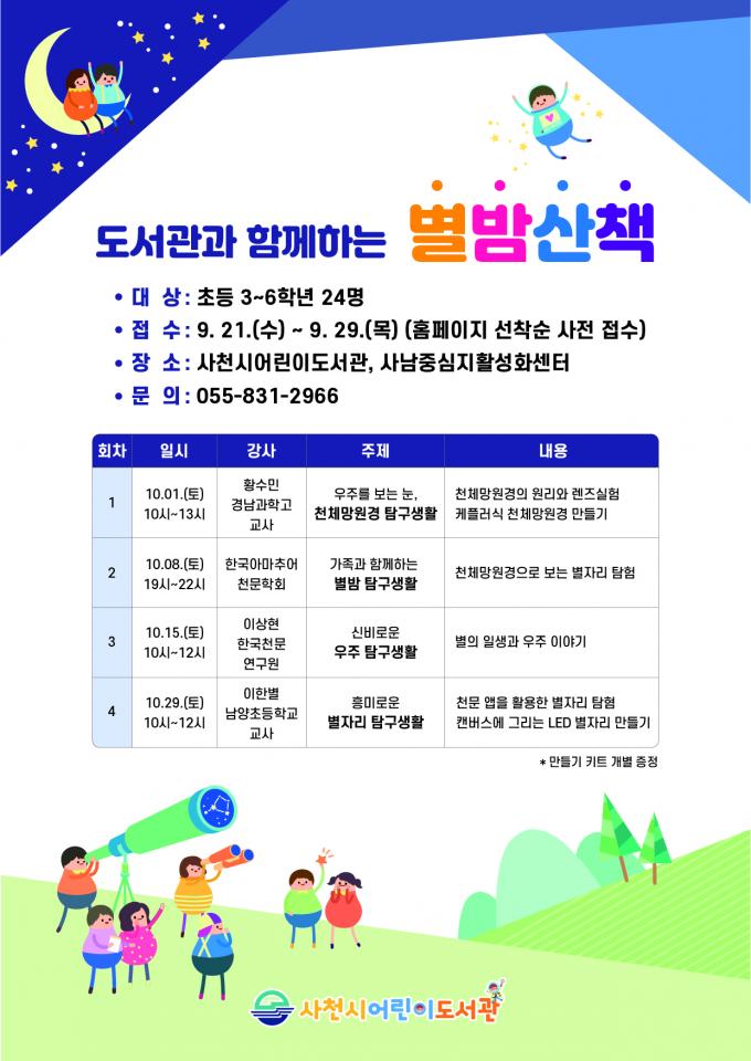 '도서관과 함께하는 별밤산책' 프로그램은 사천의 항공우주도시를 주제로 △천체 망원경 만들기 △가족과 함께하는 천체 관측 체험 △별과 우주 강연 등으로 구성된다.