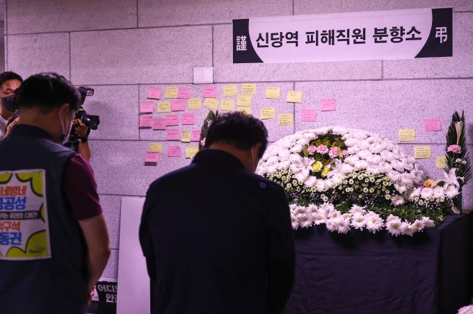 서울교통공사 노조원들이 23일 오전 1호선 시청역 구내에 마련된 신당역 피해직원 분향소를 찾아 묵념을 하고 있다.