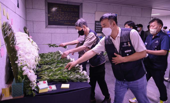 서울교통공사 노조원들이 23일 오전 서울시청 옆 인도에서 신당역 스토킹 살인사건으로 숨진 동료를 추모하는 문화제를 열고 서울시의 재발방지책 수립을 촉구했다. 이후 노조원들은 1호선 시청역 구내에 마련된 분향소를 찾아 헌화했다.